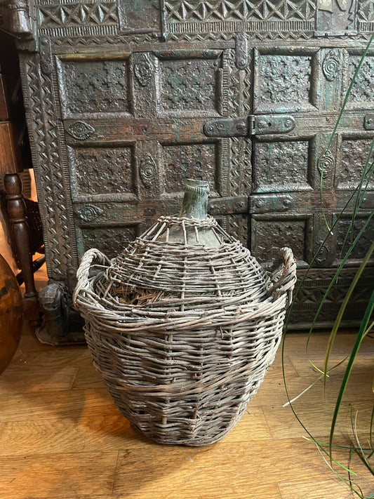 Very old demijohn carboy in its original wicker, vintage dame jeanne blown glassware 1900s