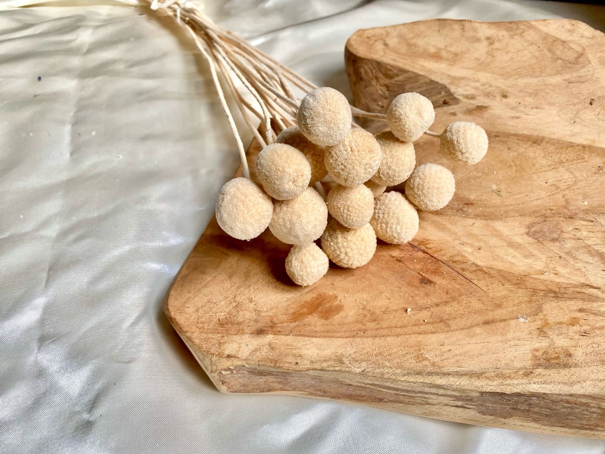 Craspedia is a long-lasting flower. It unique textural accent flower consist of 1′ golden globes on a long stiff stem. Very grass-like with silvery green foliage, the Craspedia blooms throughout the summer. ... Craspedia can retain its color as a preserved flower